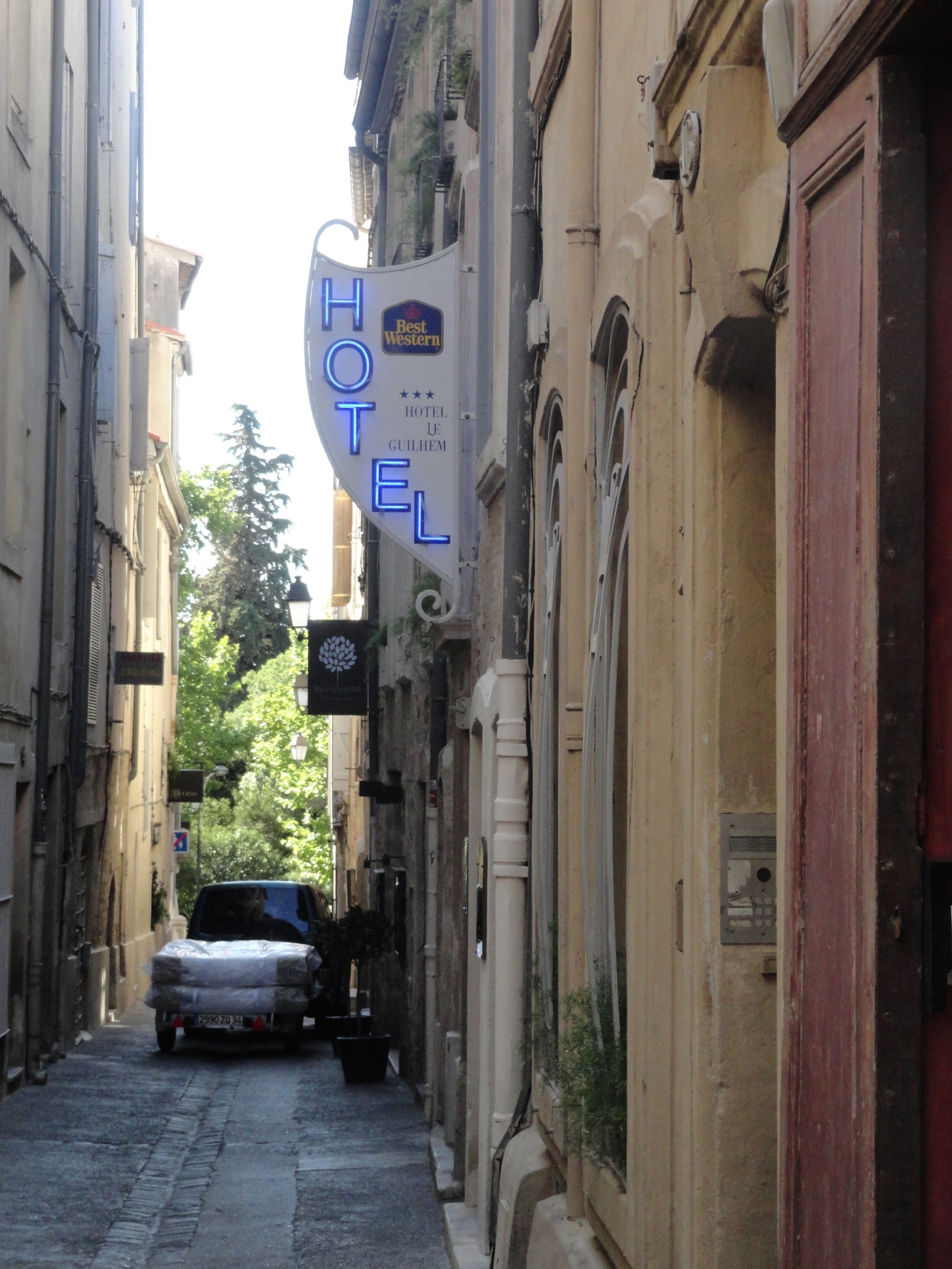 We pulled up to the entrance and opened our car doors with difficulty — the voiture in the photo is much smaller than the one we rented. We unloaded our valises and were politely instructed to park in an underground parking garage about a quarter mile away. Le Guilhelm was a former 17th century coach inn and conveniently located just steps away from wonderful restaurants and cafés.