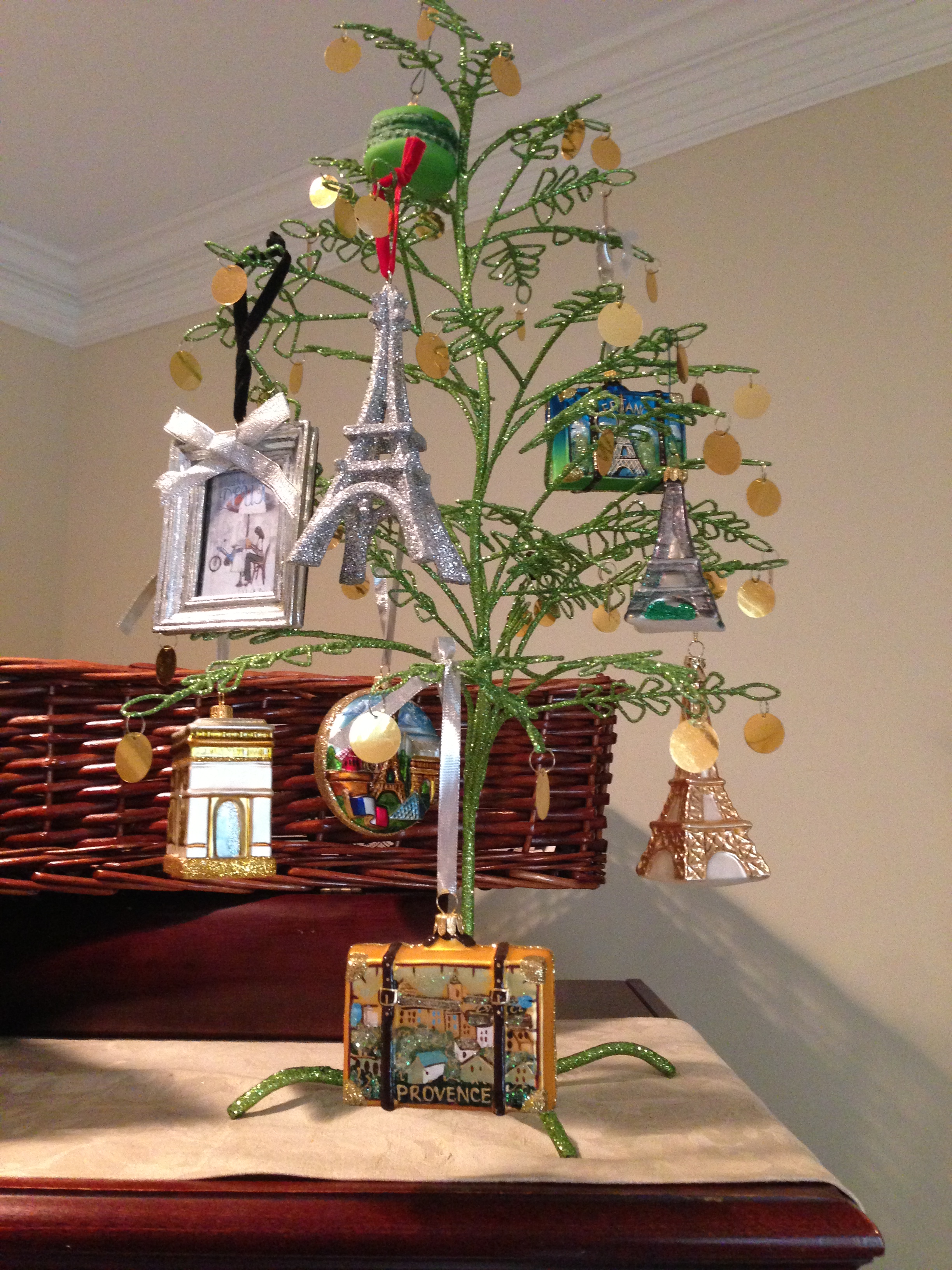 Since last Christmas, I’ve kept my Charlie Brown Christmas tree out (in my bedroom) all year. When shopping for gifts at Sur La Table earlier this month, I found the rest of the ornaments it needed, including a Buche de Noel.