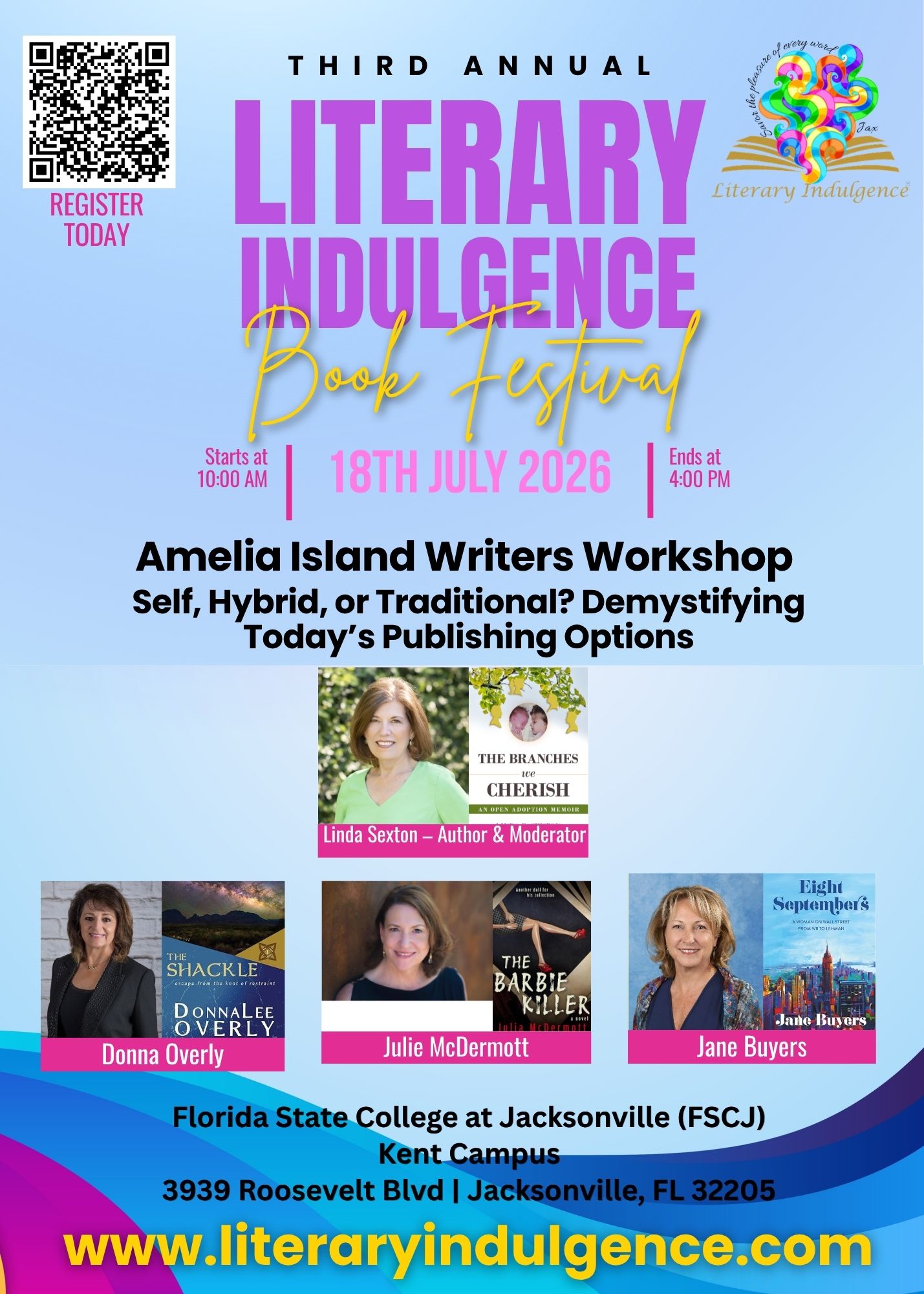 Saturday, July 18, 2026: Amelia Island Writers Workshop – Demystifying Today’s Publishing Options. Literary Indulgence Book Festival, Florida State College at Jacksonville, Kent Campus