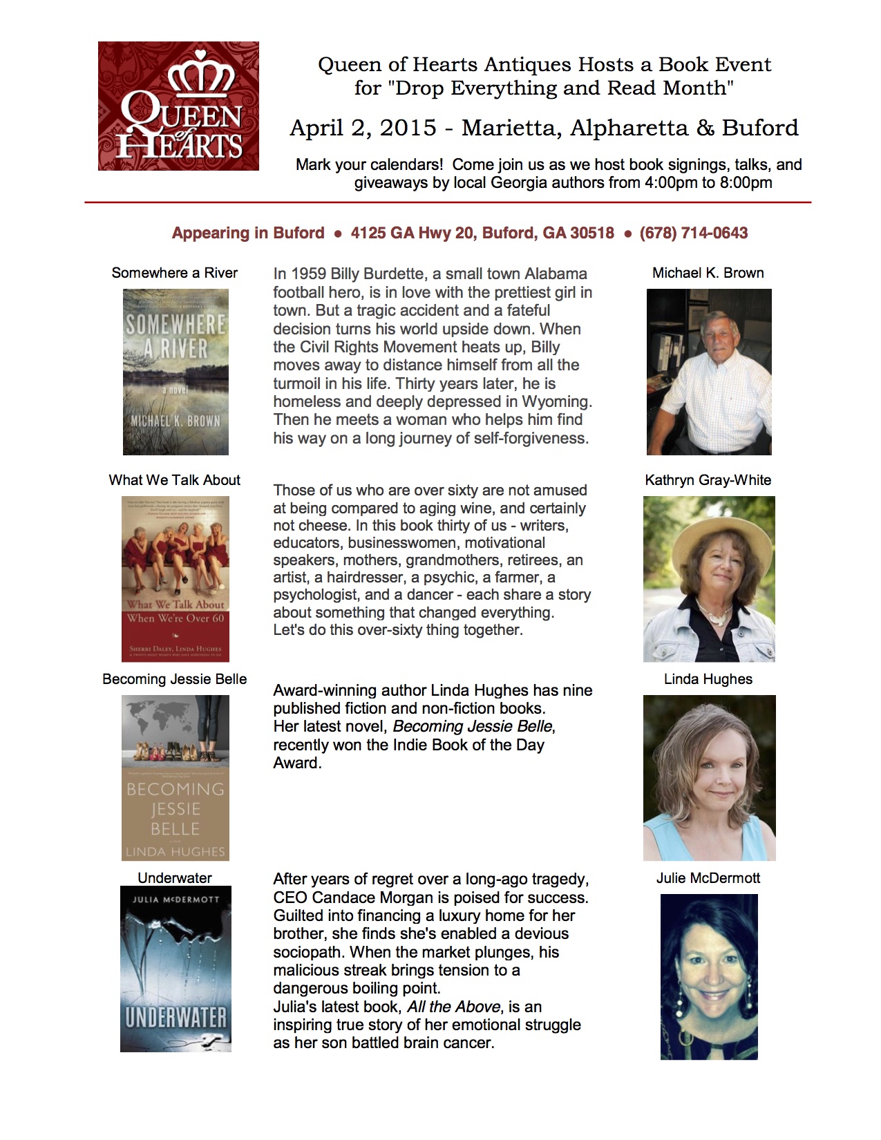 • Going to BUFORD, GA today from 4 to 8 pm with other local authors to participate in “Drop Everything and Read Month” at Queen of Hearts Antiques & Interiors! Come pick up signed copies of UNDERWATER & ALL THE ABOVE!