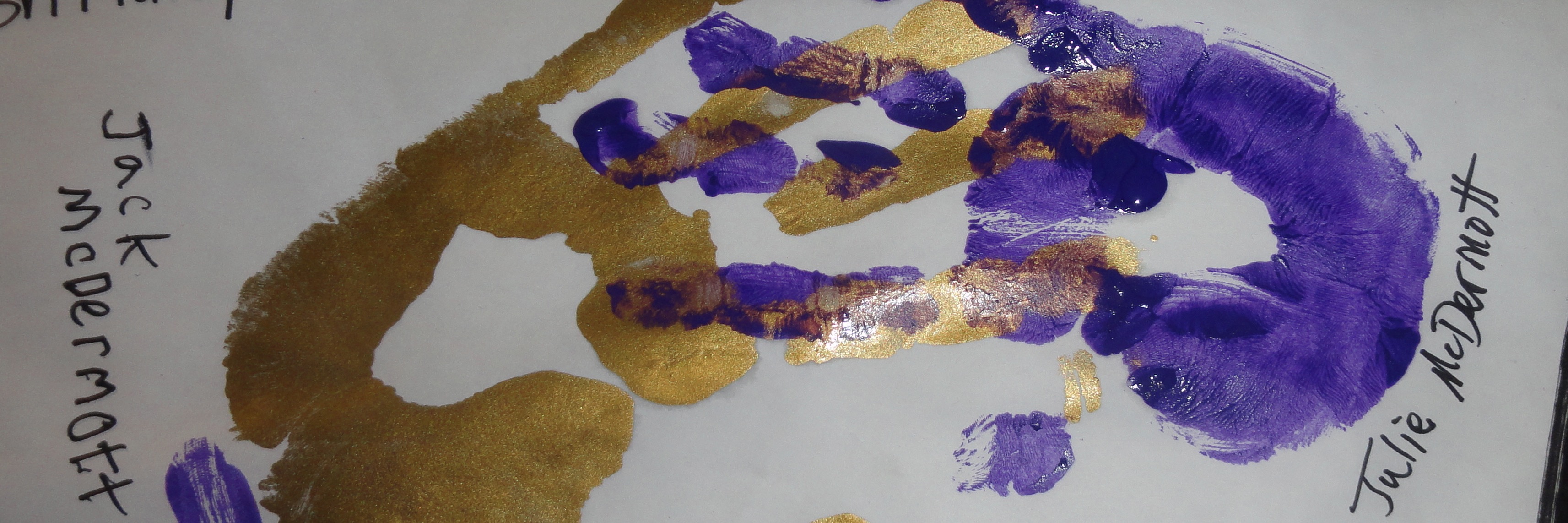 My son’s gold survivor handprint and my purple caregiver one at UGA Relay for Life 2012